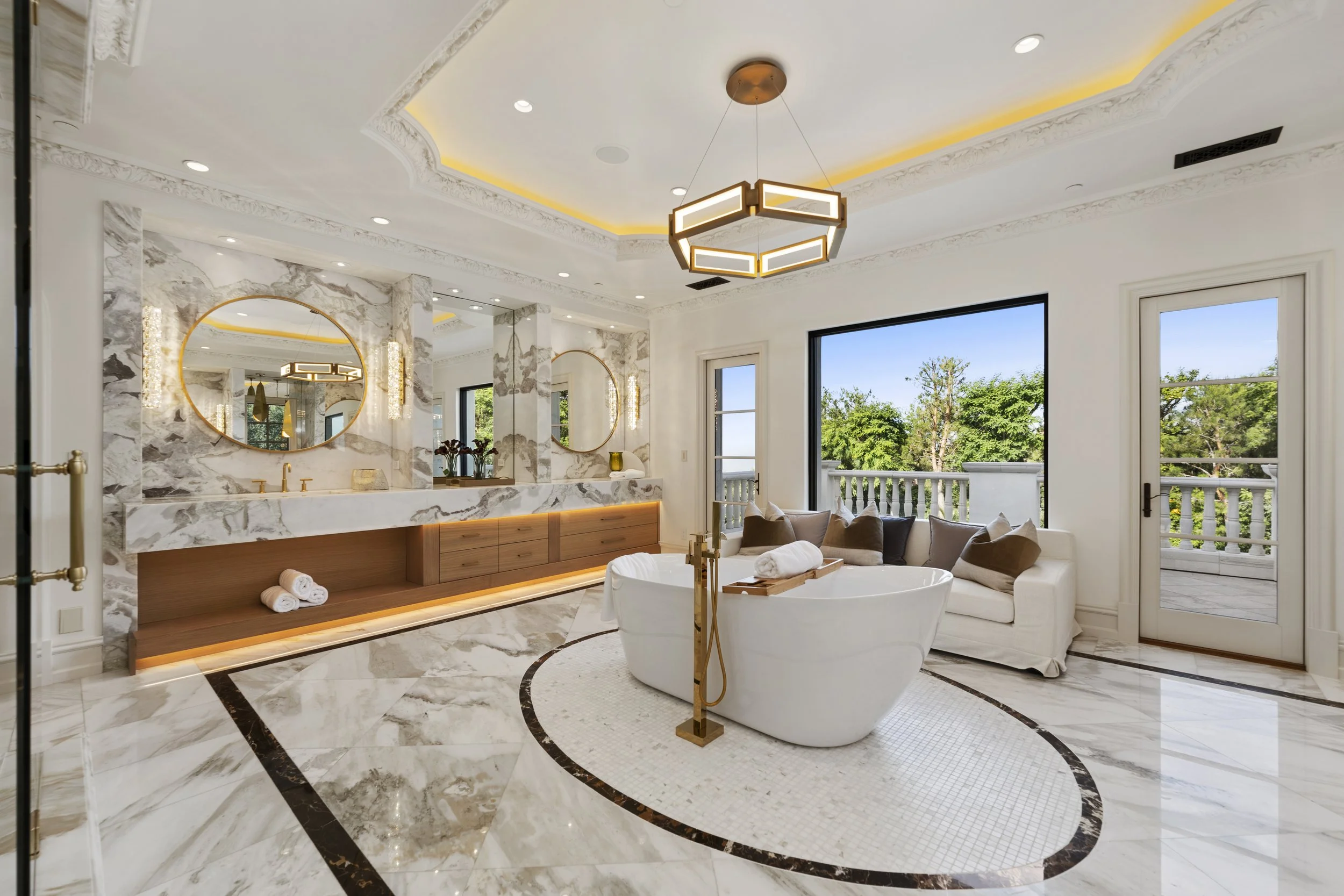 An enchanting estate fully reimagined inside and out behind the guarded gates of The Customs in Crystal Cove. Reminiscent of an Italian villa, the designer furnished 6 bedroom residence is situated on approximately 32,500 SF lot on a corner lot affording the home unique privacy. Beautifully designed by Symbiotic Studios, the home is approximately 12,234 SF and that does not include the 8 car garage and large logia spaces. Walk through the front gate and enter into your own enchanted garden with mature plants and trees. Entering through a soaring glass front door to a stately romantic modern interior with Italian Calcutta gold marble slab floors throughout the home, including a stunning circular Calcutta gold staircase with solid brass railings to all 3 levels. As you walk through the magnificent foyer to the artfully decorated living room, across the foyer is a fully paneled office with only the best of Artesian workmanship. Going further to the family living space is the Chef's kitchen & ready for entertaining! Custom marble double islands, Wolf appliances and sub-zero refrigerators. Stepping into the family room coffered ceilings, wood floors, custom movie screen with surround sound system, stunning solid marble bar and sliding glass doors to a private loggia. Equally impressive is the fabulous Primary Suite with custom moldings throughout. The Primary Bedroom has a spa like retreat that one can only dream of. The lower level is the entertainment place. Your movie theater has velvet upholstered walls with custom lighting with a fully integrated Savant stereo system throughout the home. Impressive wine cellar for the true wine collector. All this and so much more!